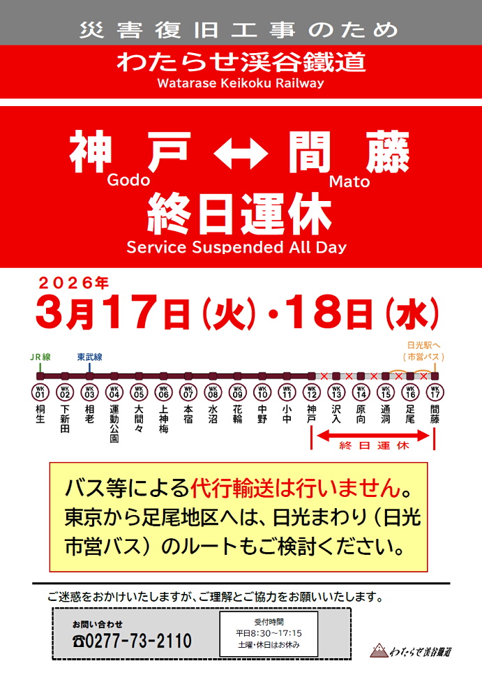 わたらせ渓谷鐵道株式会社 TEL:0277-73-2110(平日8:30〜17:15) 相老駅 TEL:0277-54-3596 大間々駅 TEL:0277-72-1117(7:30〜17:10) |