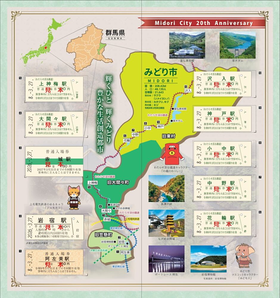 群馬県みどり市は今年20周年。これを記念して、市内全駅の入場券をセットした記念きっぷを発行します。